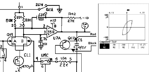 Real World ExamplesOne of the real advantages of using a component tester occurs through pattern recognition. Through the patterns presented on the screen it is possible, by using a known good circuit board or by having troubleshooting experience with the board, to quickly determine if a circuit component is bad. What follows are some real circuits with their signatures. Each signature has an explanation of why we see what we see and some considerations to take into account while interpreting the display.